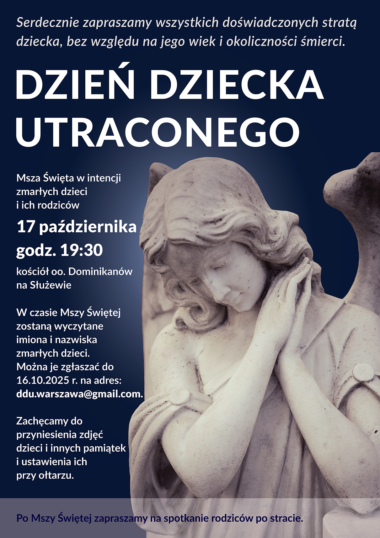 Podczas Mszy, w modlitwie powszechnej, zostaną wyczytane imiennie zmarłe dzieci, które powierzycie naszej modlitwie. Imiona i nazwiska dzieci można przesyłać na adres [email protected] do czwartku, 16 października.