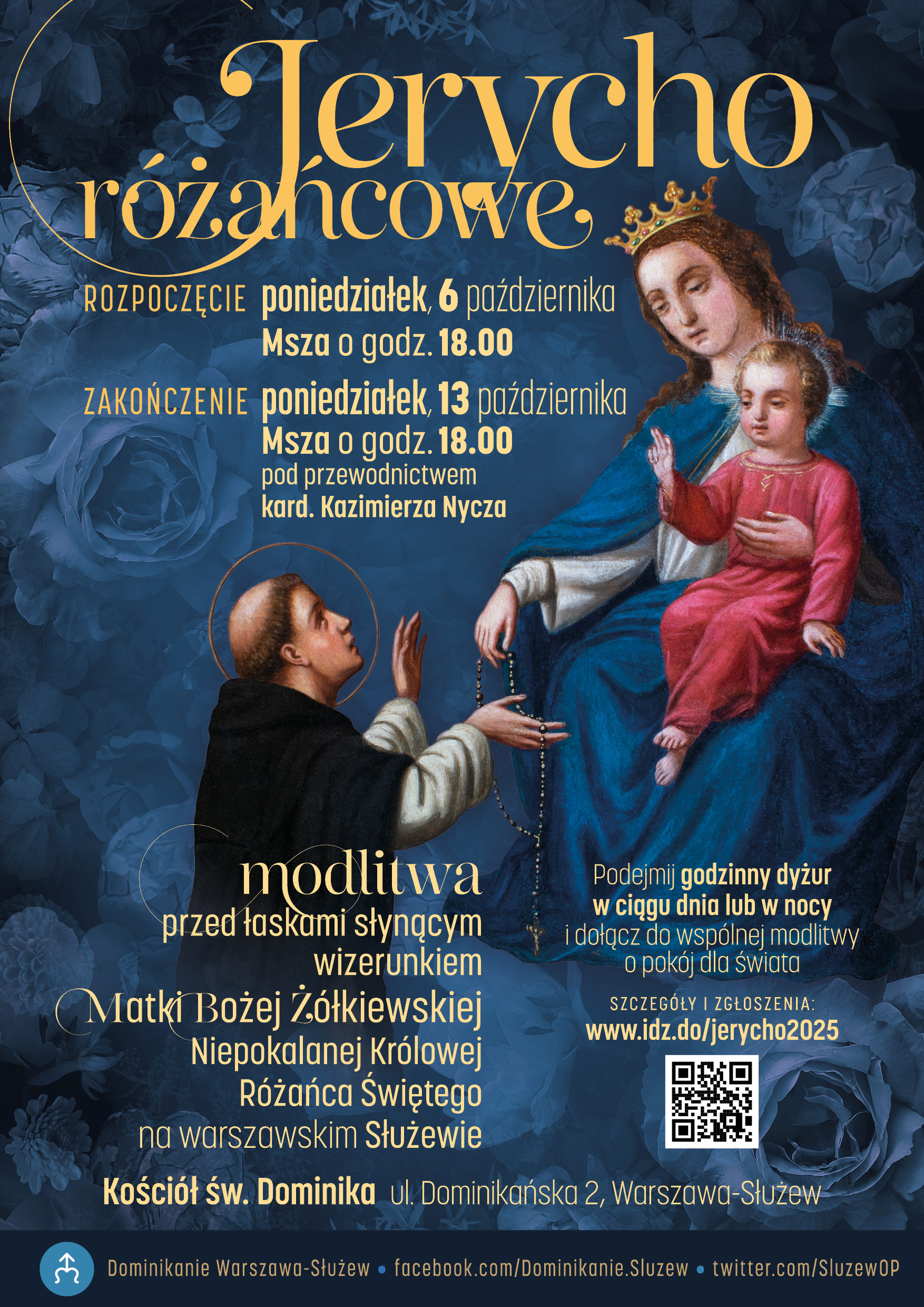 - niedziela, 12 X – w podziękowaniu za ubiegłoroczną konsekrację kościoła św. Dominika na Służewie, o Boże błogosławieństwo dla wszystkich czcicieli Maryi w 60. rocznicę rekoronacji cudownego wizerunku Matki Bożej Żółkiewskiej oraz dla członków Różańca Rodziców na Służewie w 15. rocznicę powstania
