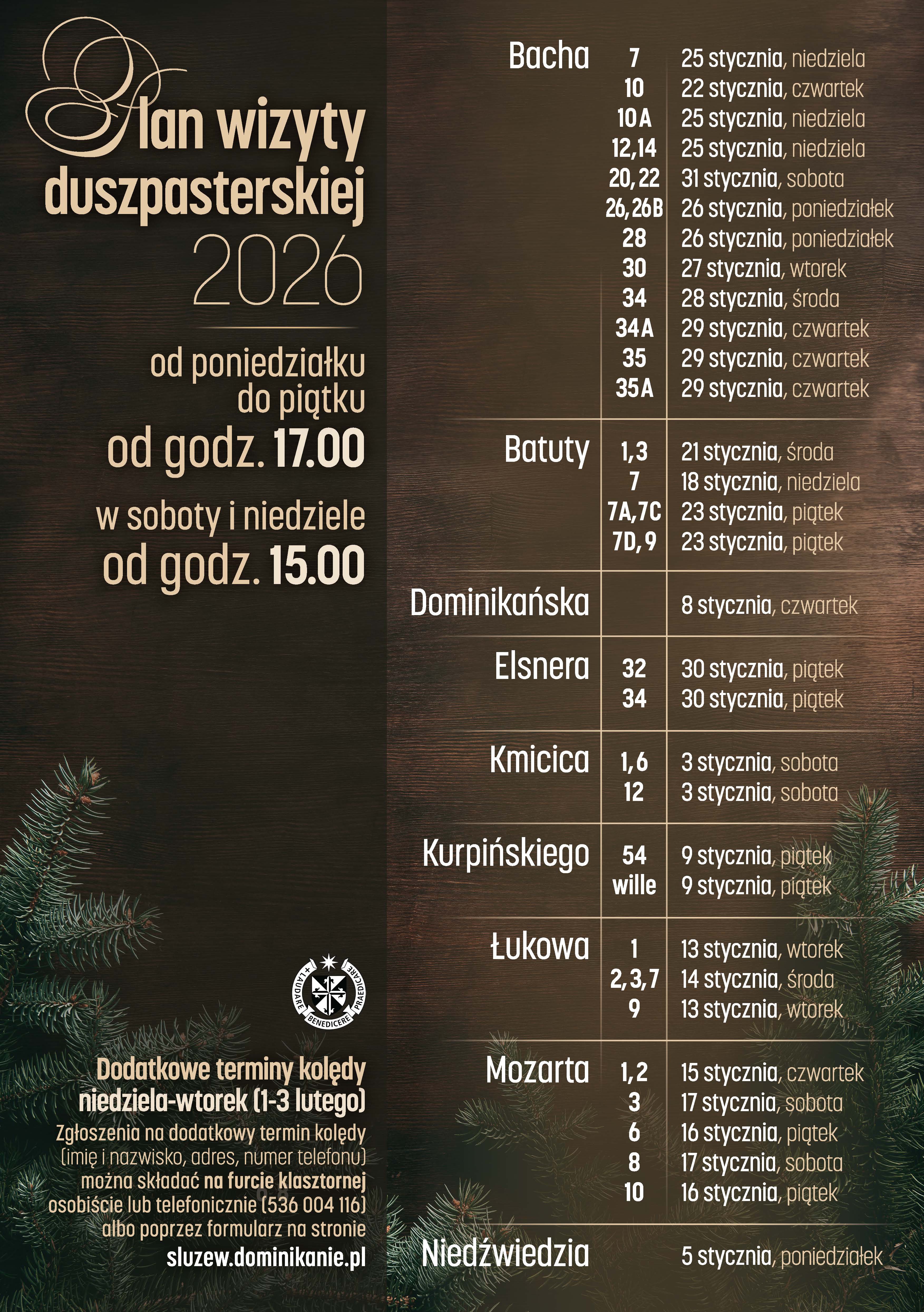 Wizytę duszpasterską (kolędę) na terenie naszej parafii rozpoczniemy w piątek, 2 stycznia 2026. Naszych Parafian będziemy odwiedzać codziennie do 3 lutego.