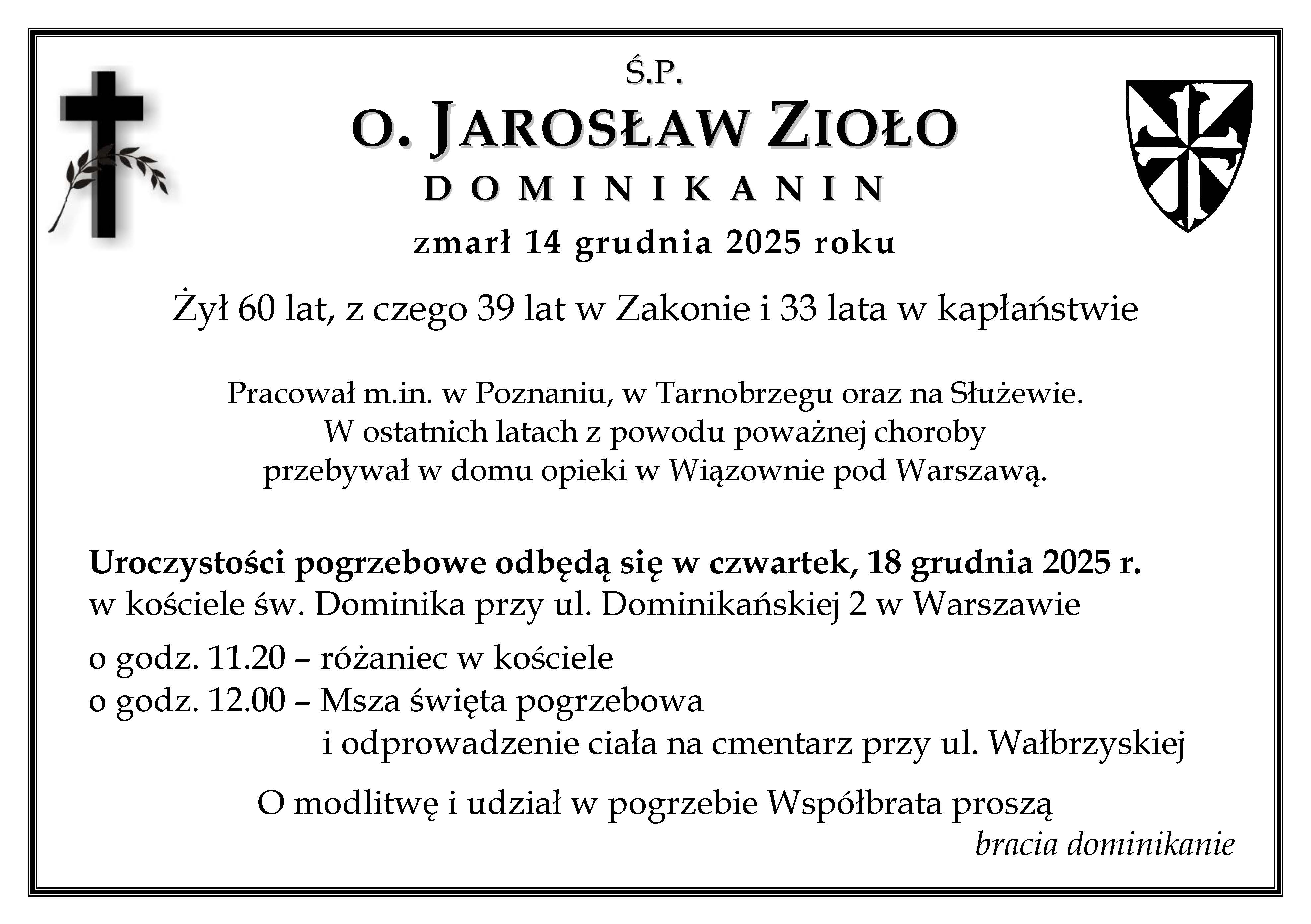 W niedzielę, 14 grudnia 2025 r., zmarł o. Jarosław Zioło OP.